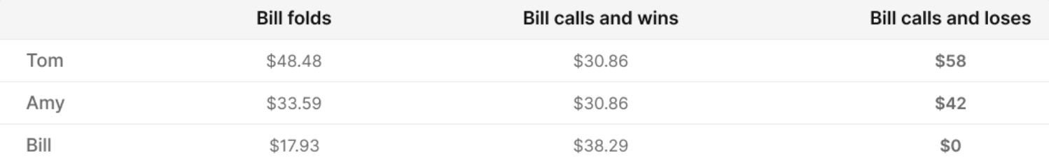 In a cash game, Bill needs to call any hand that has an equity of at least 37.5% against Tom's range. But, as we know, the chips received are not equal to the lost chips. Bill needs to compare the cost of the fold with the risk of a call. There are 3 situations: Bill folds, calls and wins, or calls and loses.