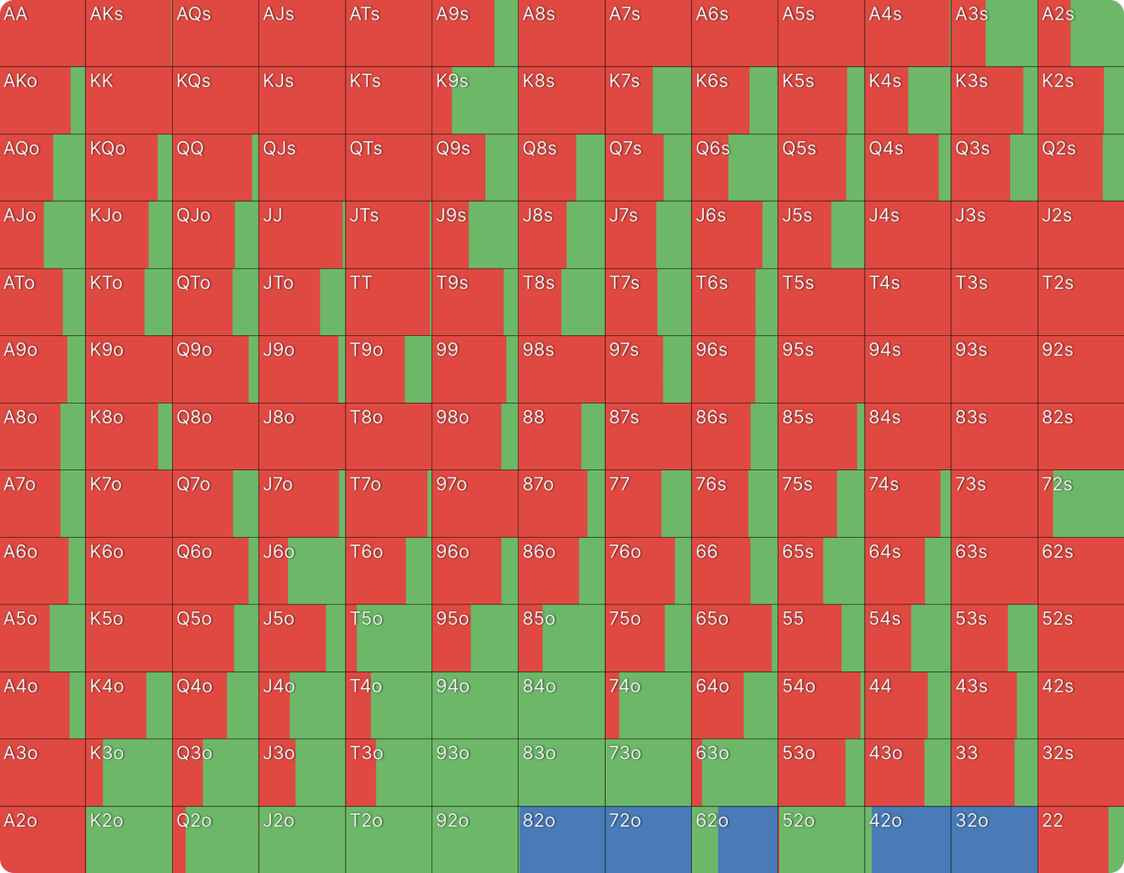 - В качестве примера давайте зафиксируем стратегию SB так, что он будет фолдить префлоп в 2 раза чаще (8% вместо изначальных 4%) и посмотрим, как это повлияет на стратегию BB.