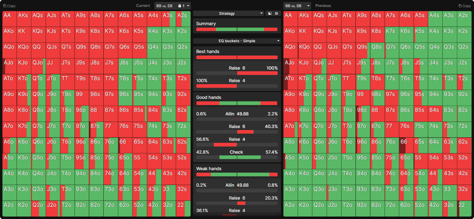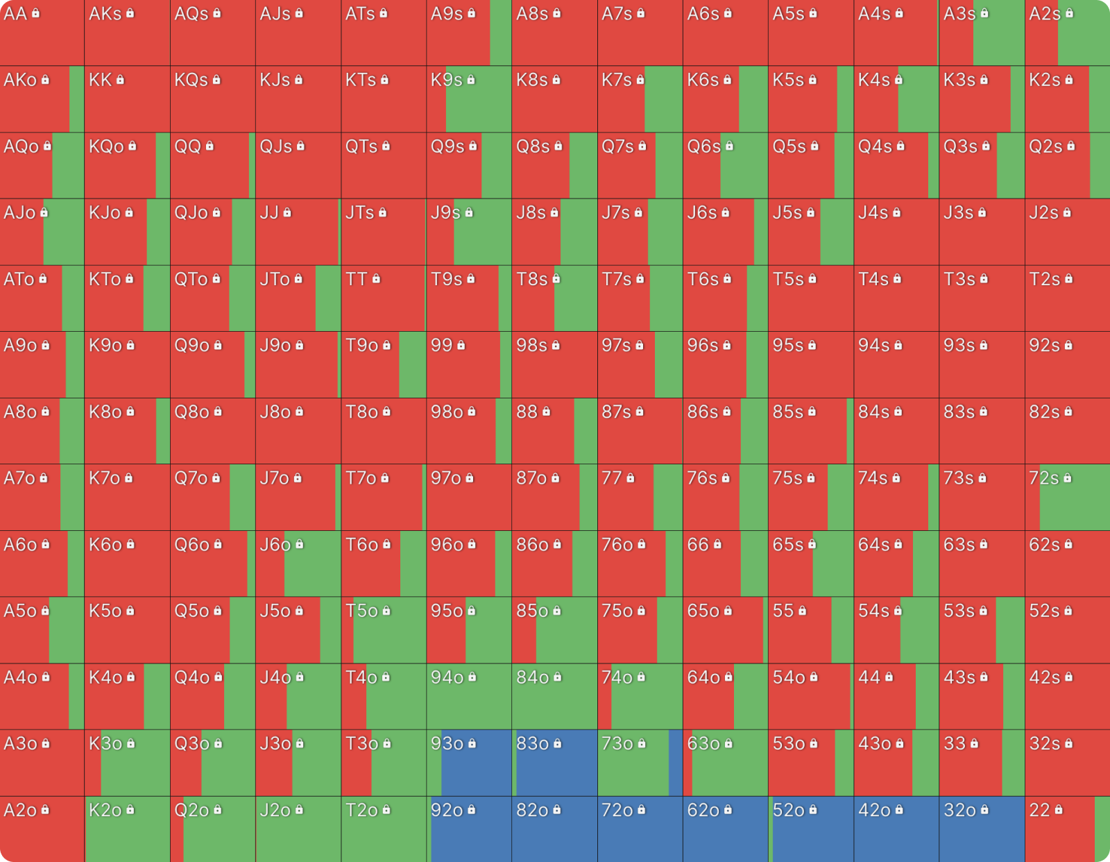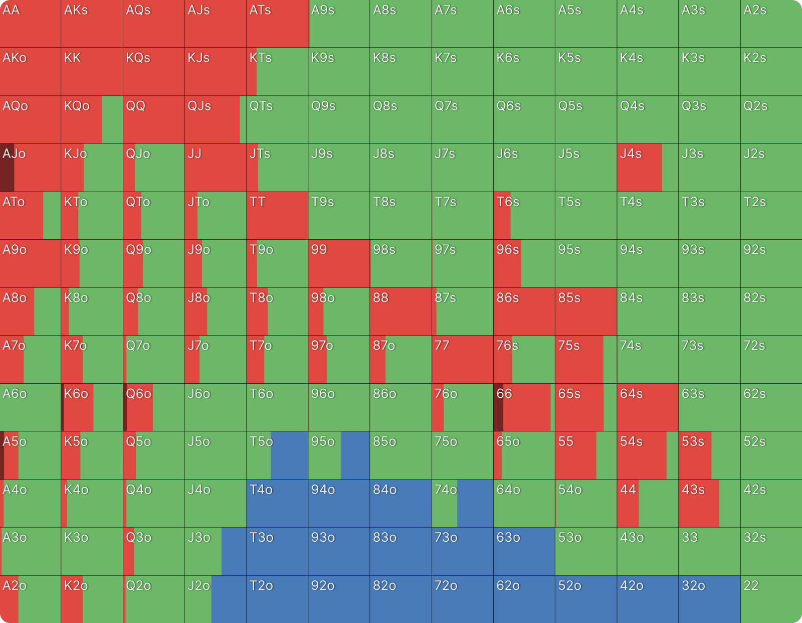 Одной из важных корректировок является то, что BB использует меньший размер рейза, 4bb вместо 6bb, из-за более сильного диапазона лимпа SB. Однако мы также видим большое увеличение диапазона рейза с 34% до 48% рук из-за меньшего размера этого рейза. Когда мы вкладываем меньше фишек в наш рейз, мы можем использовать более широкий диапазон, так как риск рейза-фолда меньше.