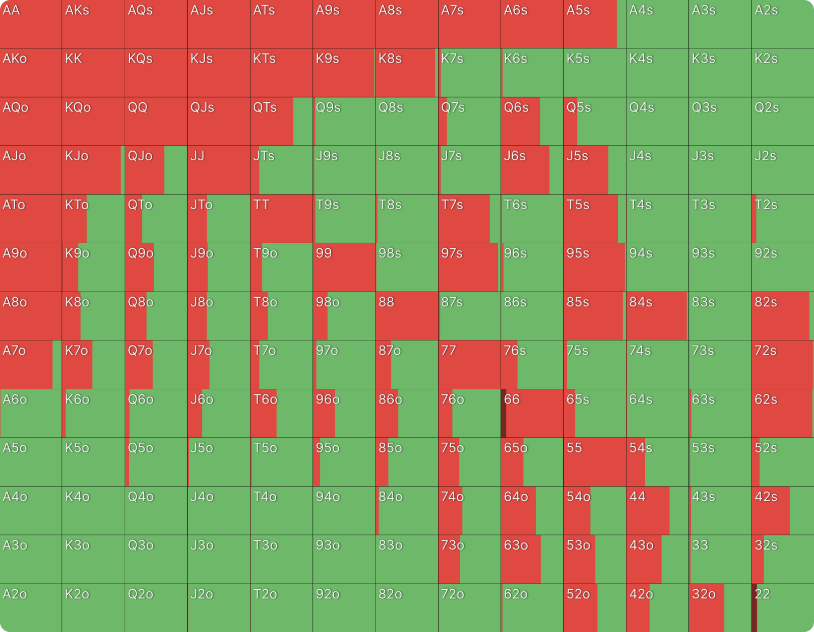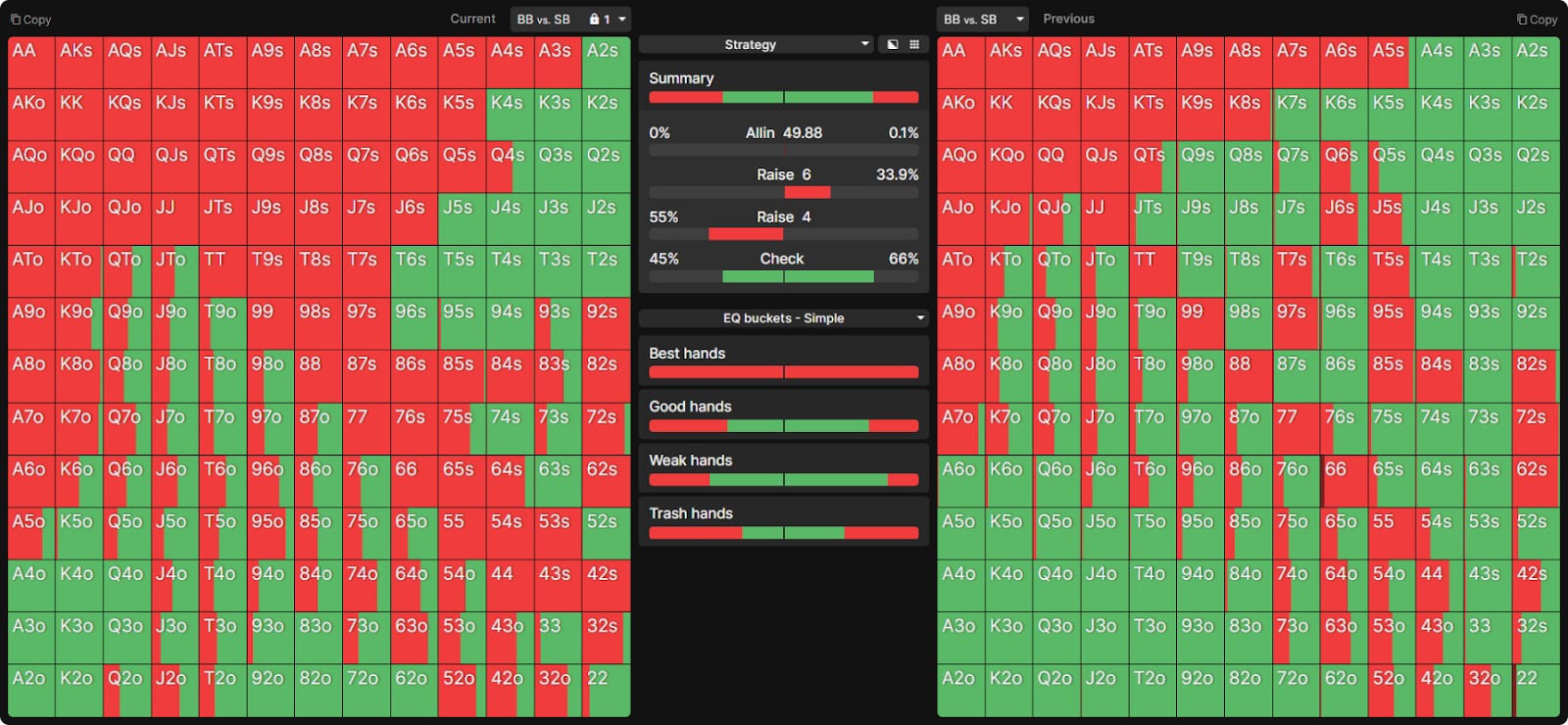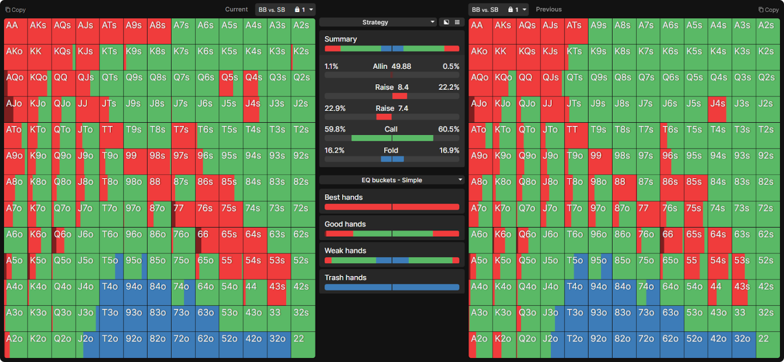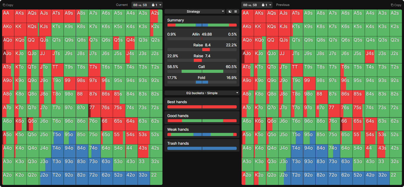Одной из важных корректировок является то, что BB использует меньший размер рейза, 4bb вместо 6bb, из-за более сильного диапазона лимпа SB. Однако мы также видим большое увеличение диапазона рейза с 34% до 48% рук из-за меньшего размера этого рейза. Когда мы вкладываем меньше фишек в наш рейз, мы можем использовать более широкий диапазон, так как риск рейза-фолда меньше.