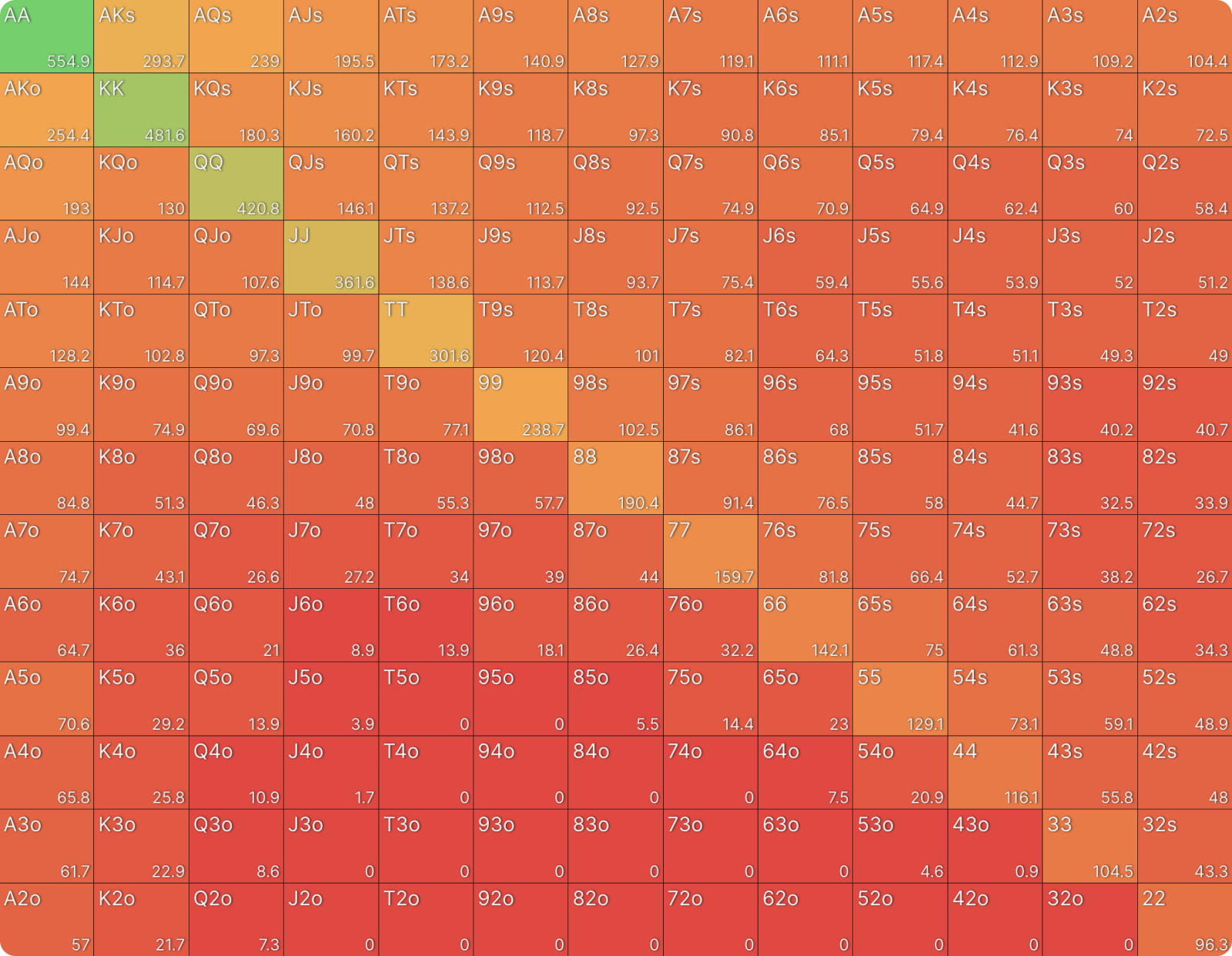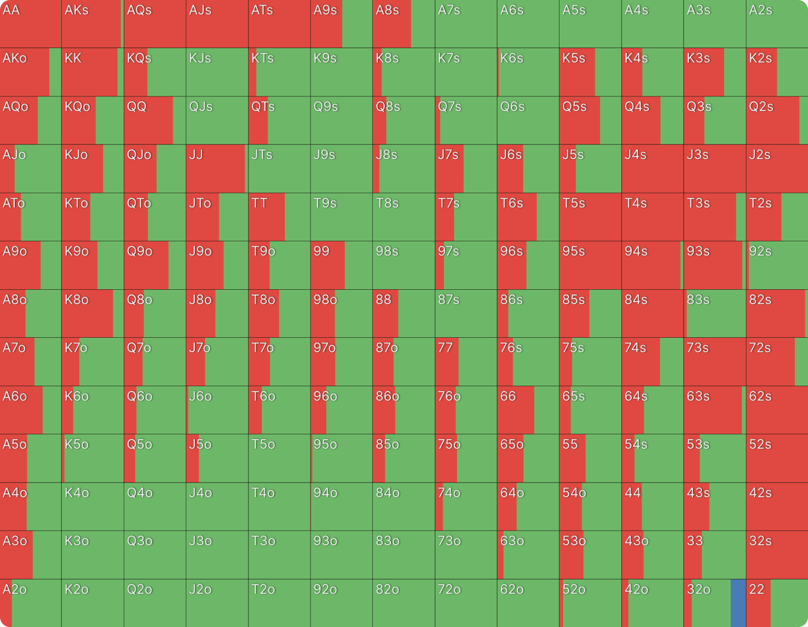 - Прежде чем рассматривать этот конкретный пример, давайте установим стандарт оптимального диапазона открытия SB в глубине 50bb. Обратите внимание, что диапазоны, используемые в этой статье, основаны на игре Chip EV с анте 0,12bb.