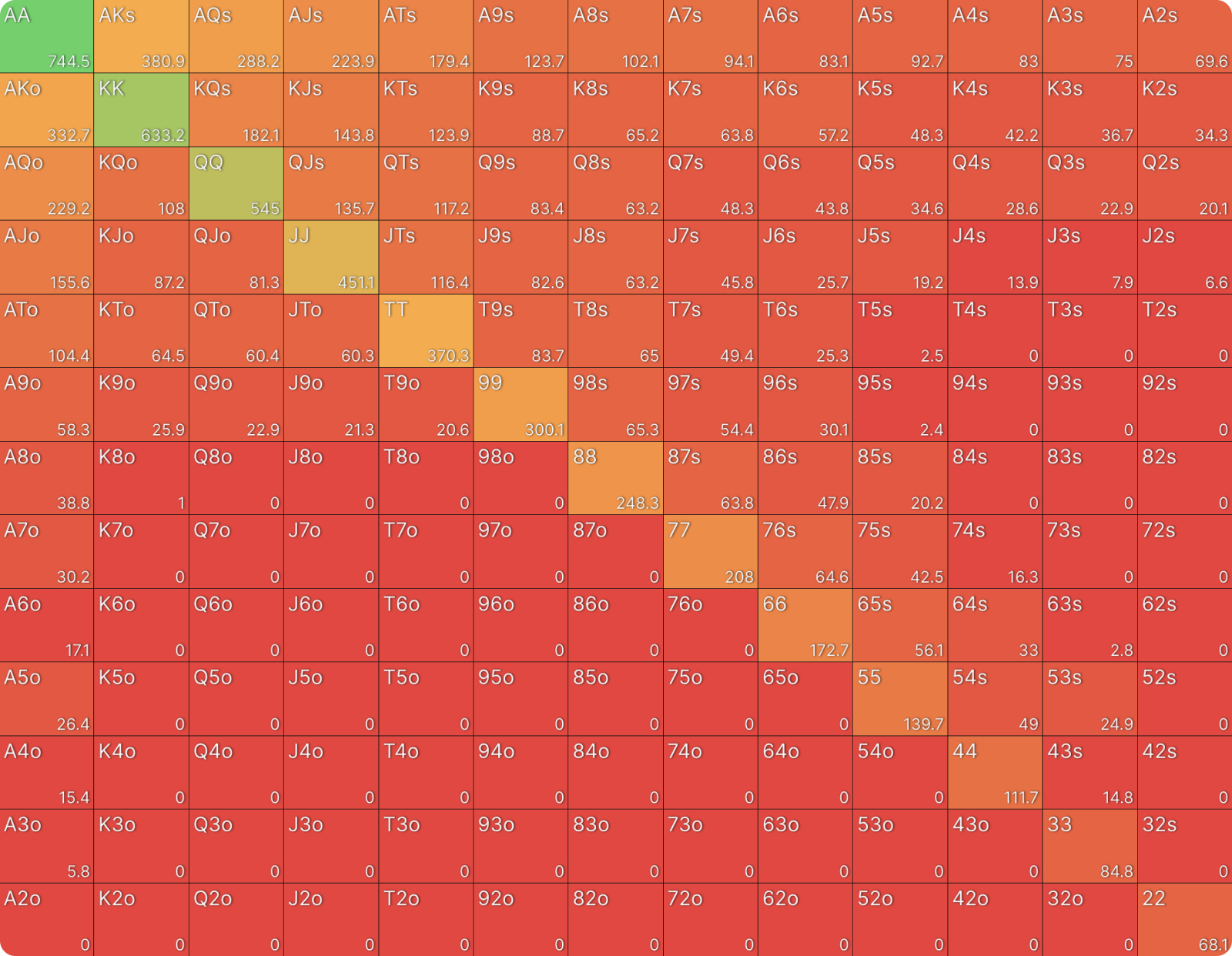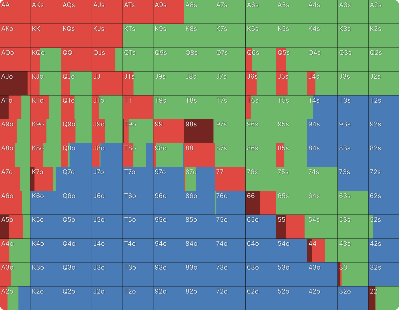 Из-за относительно высокого соотношения стека к банку (SPR) мы можем видеть, что большинство рук делают рейзы с высокой частотой, также присутствует лимп, чтобы сбалансировать нижнюю часть диапазона SB. В целом, SB сбрасывает только 4% рук.