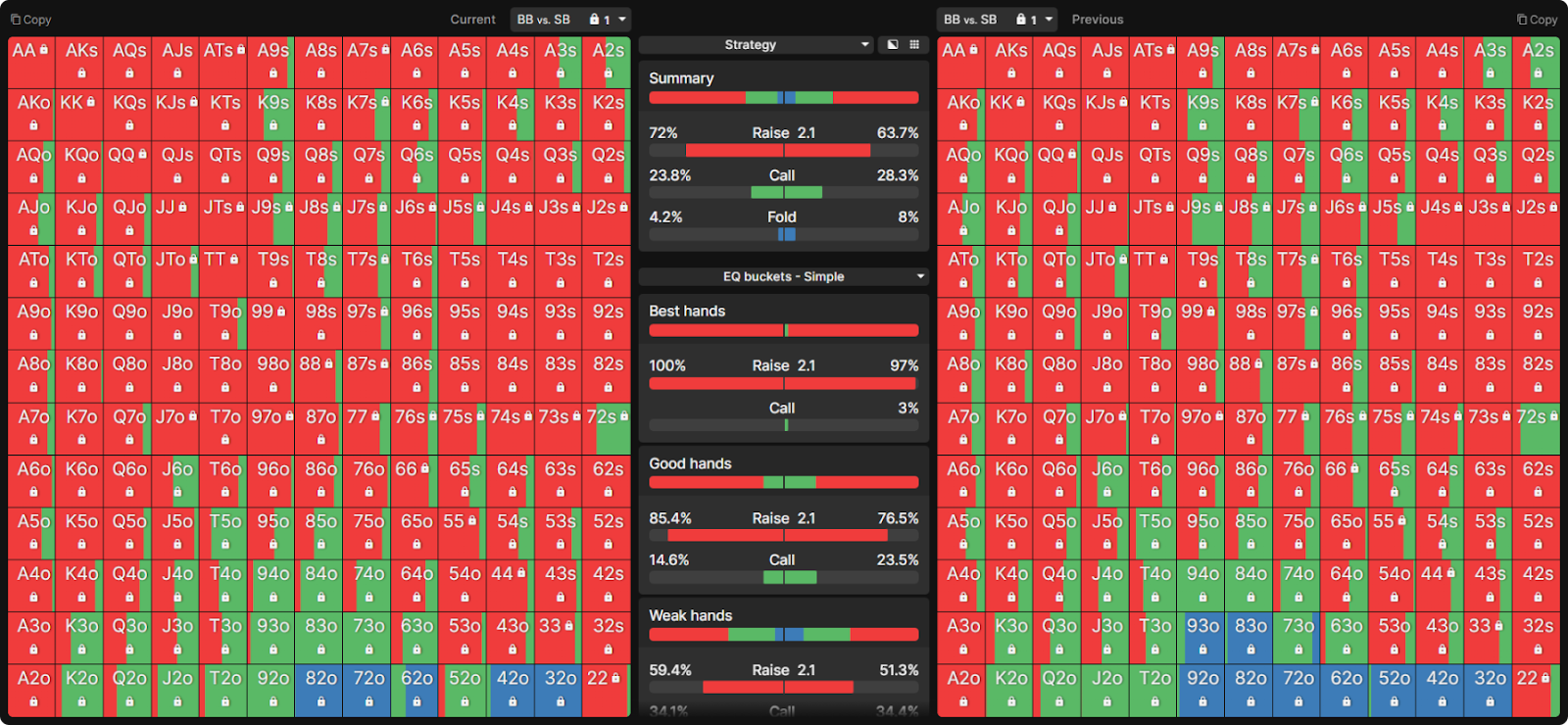 - Для примера, давайте расширим диапазон открытия SB с 64% до 72% и посмотрим, как тогда отреагирует BB: